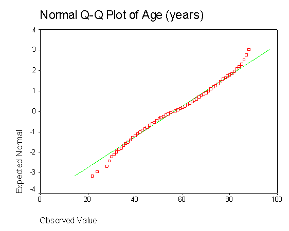 ![]() You can also construct a normal probability plot. In this plot, the actual scores are ranked and sorted, and an expected normal value is computed and compared with an actual normal value for each case. The expected normal value is the position a case with that rank holds in a normal distribution. The normal value is the position it holds in the actual distribution. Basically, you would like to see your actual values lining up along the diagonal that goes from lower left to upper right. This plot also shows that age is normally distributed: